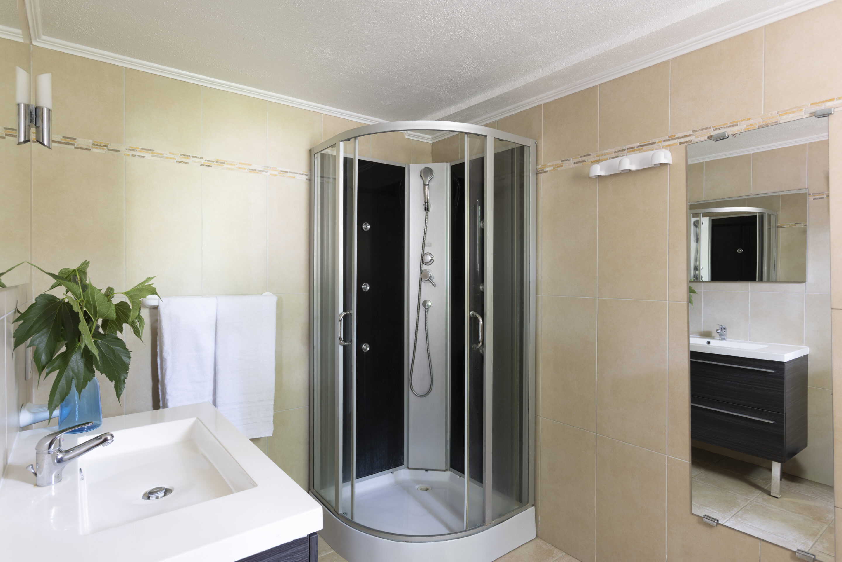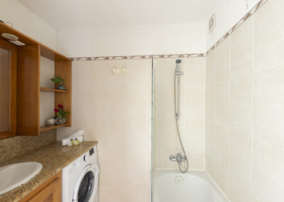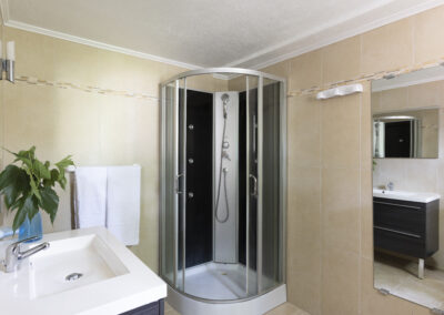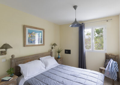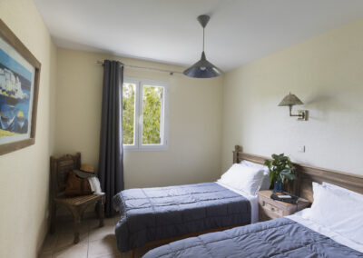 une avec un lit double et une avec deux lits jumeaux. La salle de bain comprend une douche ou une baignoire ainsi que des toilettes.